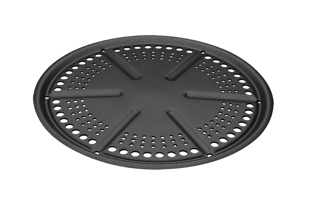 universali grilio lėkštė, grotelės, „Griddle“ lėkštė, „Pan“ keptuvė, „Frying Dish“ gili keptuvė, paaukštinimo žiedas, stovelis vištai, pakėlimo rankena bei krepšys.
